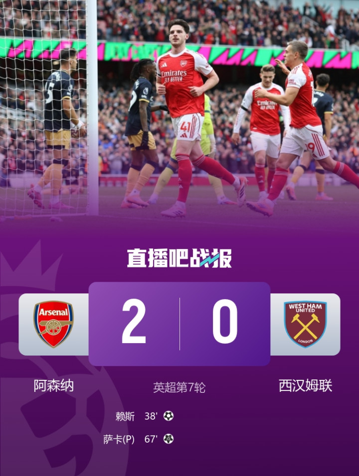 登顶!阿森纳2-0西汉姆赖斯破旧主+伤退萨卡点射厄德高伤退