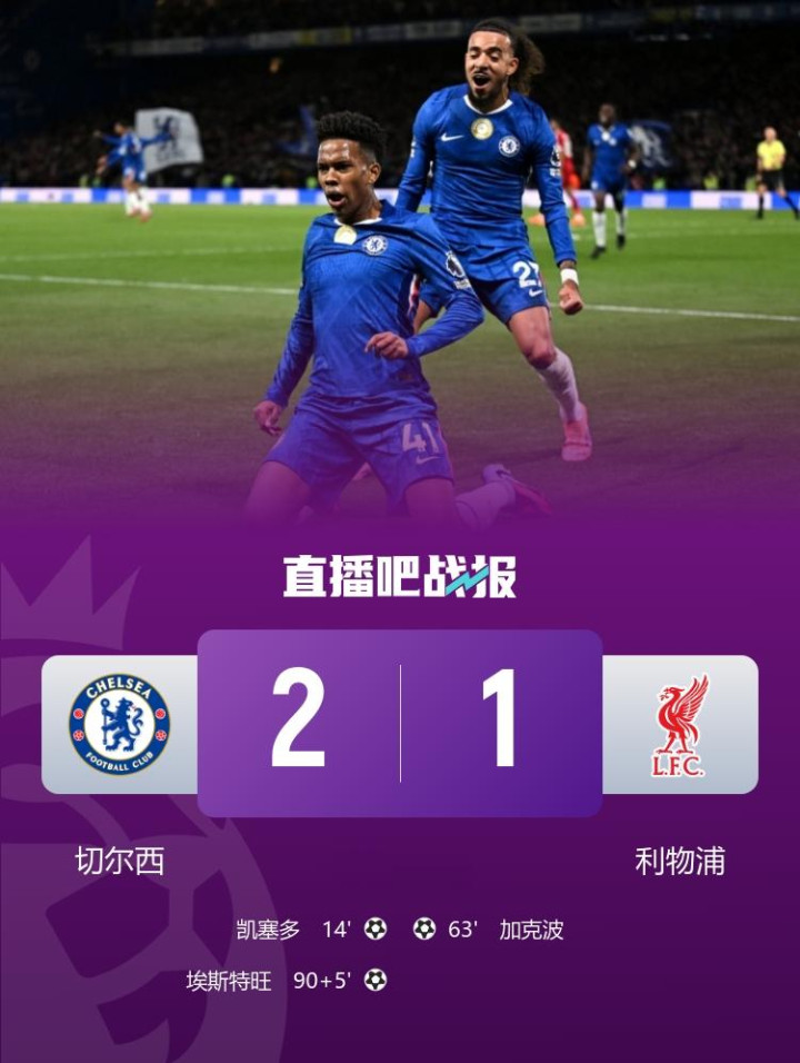 切尔西2-1绝杀送利物浦三连败埃斯特旺补时绝杀凯塞多世界波