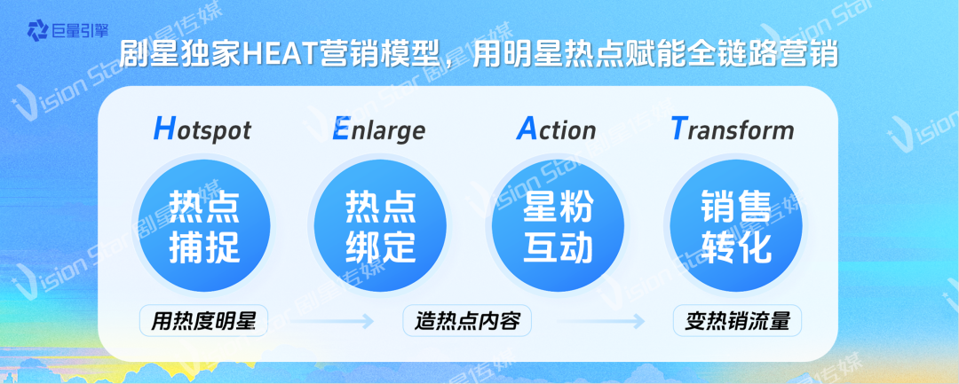 剧星将丰富实践经验总结提升,形成一套以明星热点赋能全链路营销的模型——HEAT营销模型。该模型系统化涵盖热点捕捉(Hotspot)、热点绑定(Enlarge)、星粉互动(Action)和销售转化(Transform)四个环节,旨在科学、高效地将明星热度转化为品牌增长。