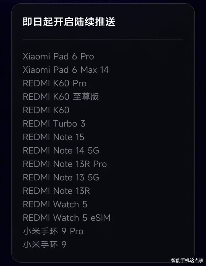 具体机型清单如下:平板类包括Xiaomi Pad 6 Pro、Xiaomi Pad 6 Max 14;手机类包括REDMI K60 Pro、REDMI K60 至尊版、REDMI K60、REDMI Turbo 3、REDMI Note 15、REDMI Note 14 5G、REDMI Note 13R Pro、REDMI Note 13 5G、REDMI Note 13R。