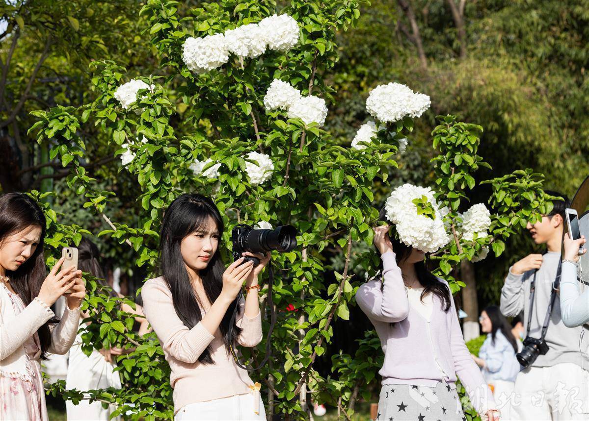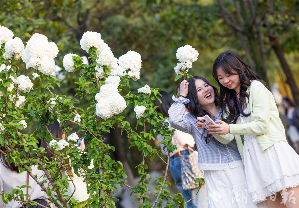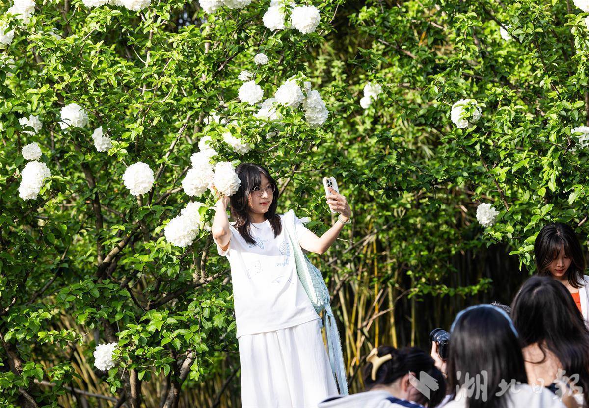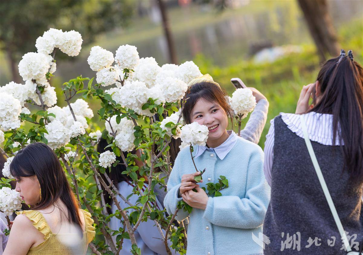 4月4日,武汉沙湖公园内绣球花竞相绽放,洁白花团缀满枝头,市民游客趁晴踏青赏花,驻足拍照打卡,在繁花春色中感受春日美好,乐享清明假期惬意时光。(湖北日报全媒记者 薛婷 摄)
