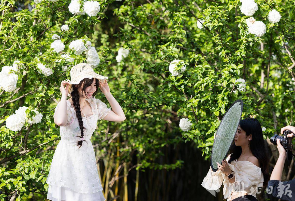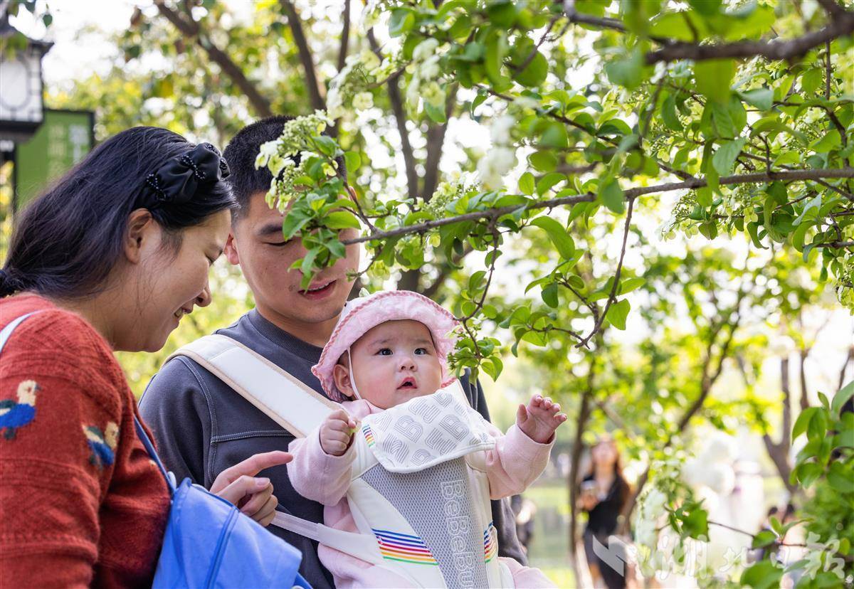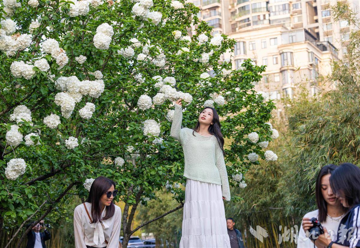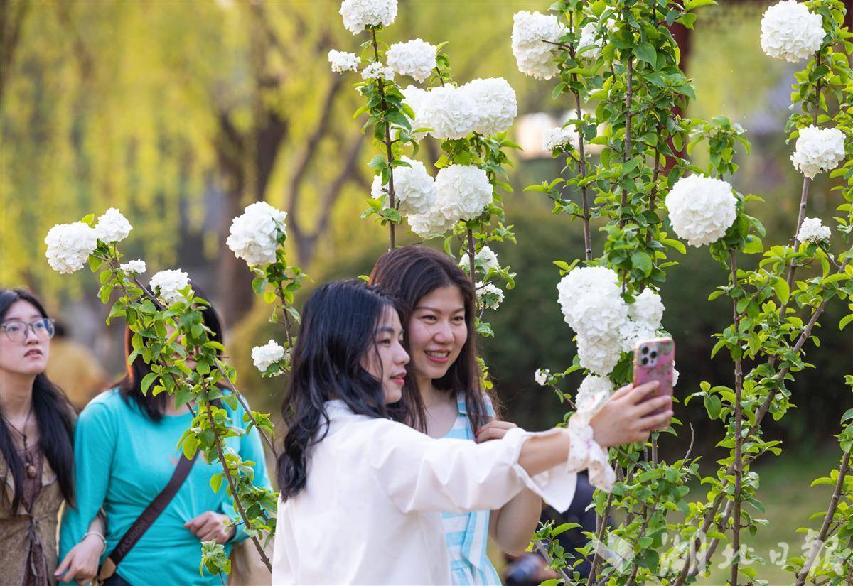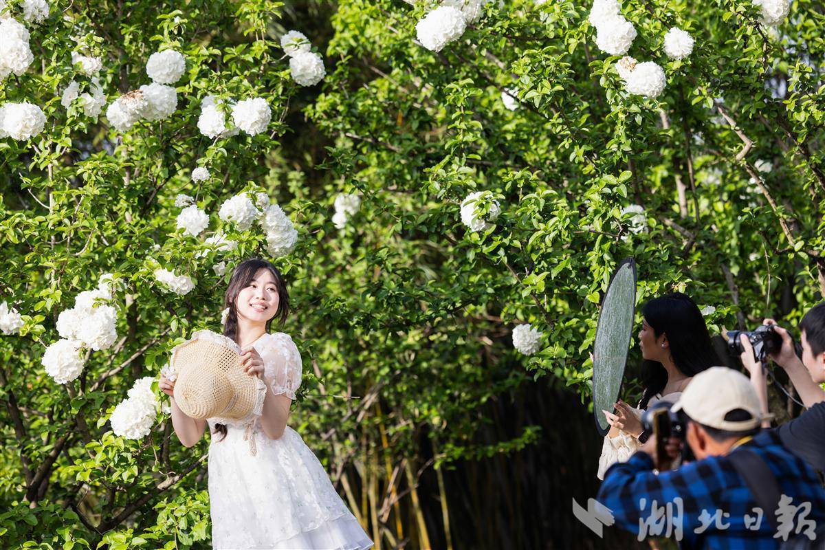 4月4日,武汉沙湖公园内绣球花竞相绽放,洁白花团缀满枝头,市民游客趁晴踏青赏花,驻足拍照打卡,在繁花春色中感受春日美好,乐享清明假期惬意时光。(湖北日报全媒记者 薛婷 摄)
